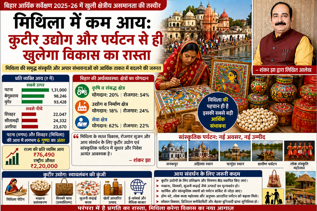 मिथिला, जो अपनी समृद्ध सांस्कृतिक विरासत, सुविख्यात विद्वता और अद्वितीय कला परंपरा के लिए विश्वभर में जानी जाती है, आज एक विरोधाभासी स्थिति से गुजर रही है। एक ओर जहाँ इसकी सांस्कृतिक पहचान अत्यंत सुदृढ़ है, वहीं दूसरी ओर आर्थिक मोर्चे पर यह क्षेत्र विहार के अन्य हिस्सों की तुलना में पिछड़ गया है। प्रति व्यक्ति आय में इस गिरावट को रोकने और क्षेत्रीय विकास को गति देने के लिए कुटीर उद्योगों का पुनरुद्धार और सांस्कृति पर्यटन का विस्तार ही एकमात्र टिकाऊ समाधान प्रतीत होता है।